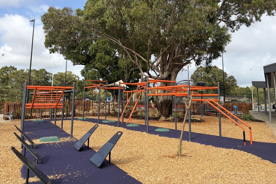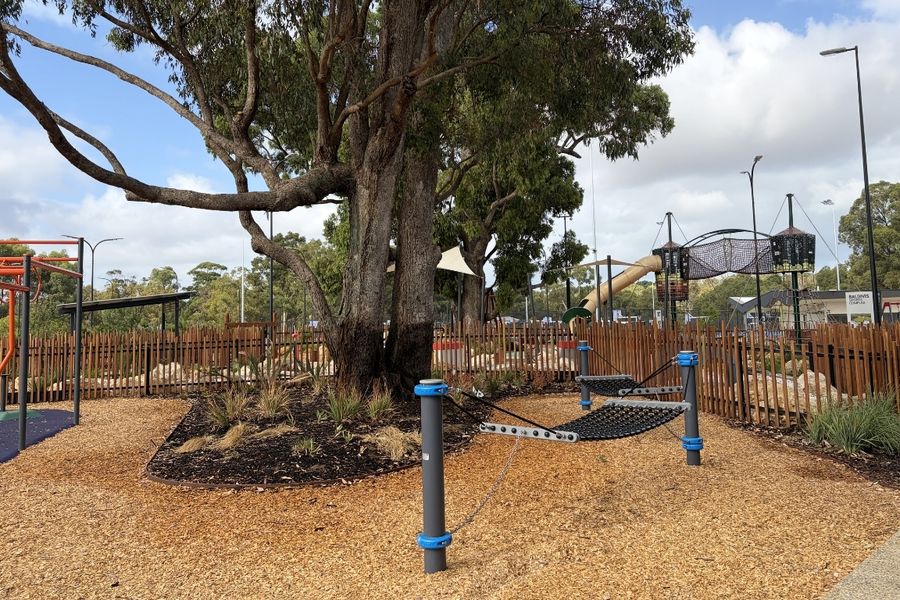 A colourful play space with a high rope tunnel and opportunities for sand and water play sits in the shade of two beautiful tuart trees. Accompanied by a ninja course and skate park, and a cafe right next door, itโ€™s a great spot for the whole family!