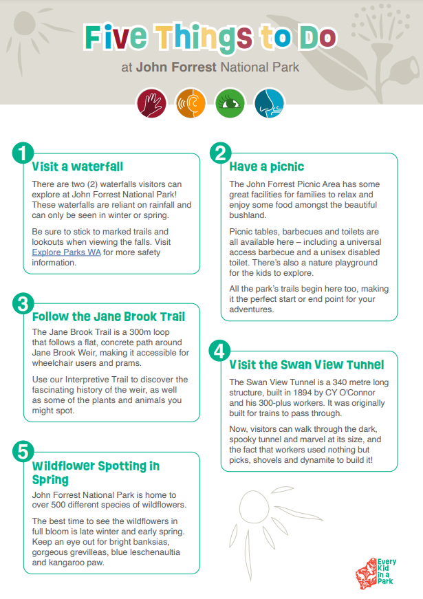 Located in the Darling Ranges on Whadjuk country, about 30 minutes east of Perth city, John Forrest National Park is Perth’s first and oldest national park. With waterfalls and wildflowers in season, a variety of walk trails, and a spooky old railway tunnel, there is so much to explore! Let us help you prepare for a fun, family day out with this list of five fun things to do at John Forrest National Park.